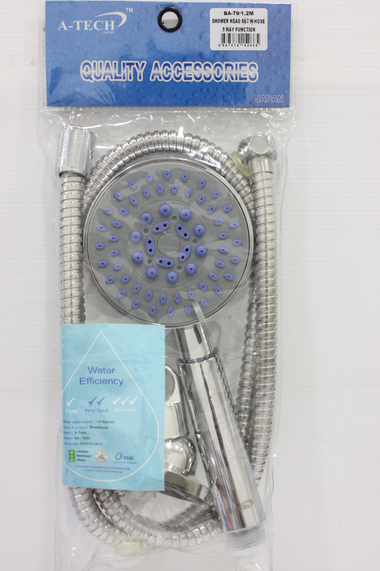 SHOWER HEAD SET W/HOSE (5 WAY-FUNCTION) is ergonomically designed for multiple spraying functions to suit consumer`s preference it has a appealing design. Comes with a Wall mounted holder to secure the shower head onto the walls when not in use. Includes a 120cm flexi hose & washers.